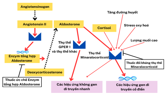 Ngày càng có nhiều bằng chứng cho thấy aldosterone và sự hoạt hóa thụ thể mineralocorticoid có vai trò bệnh sinh vượt ra ngoài điều hòa thể tích tuần hoàn. Thụ thể mineralocorticoid được biểu hiện rộng rãi tại các mô ngoài thận như tế bào nội mô, cơ trơn mạch máu, cơ tim và cầu thận. Sự hoạt hóa thụ thể này gây rối loạn chức năng nội mô thông qua giảm sinh khả dụng nitric oxide, tăng stress oxy hóa và thúc đẩy phản ứng viêm, dẫn đến tăng trương lực mạch, tái cấu trúc thành mạch và tăng độ cứng động mạch, từ đó duy trì tình trạng tăng huyết áp kháng trị. Tại thận, sự hoạt hóa quá mức trục aldosterone–thụ thể mineralocorticoid thúc đẩy viêm và xơ hóa thông qua tăng biểu hiện các chất trung gian như plasminogen activator inhibitor-1, transforming growth factor-beta và interleukin-6, gây tổn thương cầu thận và mô kẽ, làm tiến triển bệnh thận mạn độc lập với mức huyết áp. Đáng chú ý, thụ thể mineralocorticoid không chỉ bị hoạt hóa bởi aldosterone mà còn có thể bị kích hoạt bởi cortisol khi chức năng enzyme 11β-hydroxysteroid dehydrogenase-2 suy giảm, cũng như bị tăng biểu hiện và hoạt hóa độc lập với nồng độ aldosterone trong các bệnh lý tim–thận, góp phần giải thích hiện tượng “aldosterone breakthrough” khi điều trị ức chế hệ renin–angiotensin. Như vậy, aldosterone không chỉ là hormone điều hòa huyết áp mà còn là yếu tố trung tâm trong bệnh sinh tim mạch – thận và tăng huyết áp kháng trị, tạo cơ sở cho các chiến lược điều trị nhắm đích aldosterone và thụ thể mineralocorticoid.