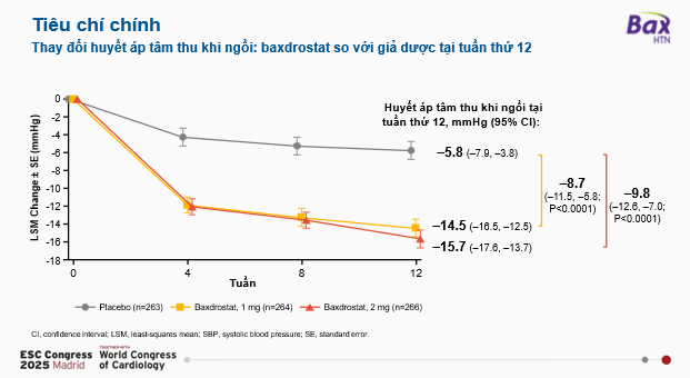Baxdrostat với mức độ chọn lọc cao là 100:1, đã được báo cáo là làm giảm huyết áp cũng như aldosterone trong huyết thanh và nước tiểu, mà không ảnh hưởng đến nồng độ cortisol. Gần đây, trong hội nghị Tim mạch châu Âu năm 2025 (ESC 2025), đã công bố nghiên cứu BaxHTN. Nghiên cứu BaxHTN là một thử nghiệm lâm sàng pha III, đa trung tâm, ngẫu nhiên, mù đôi, đối chứng giả dược, được tiến hành trên 796 bệnh nhân bị tăng huyết áp không kiểm soát hoặc kháng trị (tức vẫn cao huyết áp dù dùng ≥ 2 thuốc hoặc ≥ 3 thuốc, bao gồm lợi tiểu), tại 214 trung tâm trên toàn cầu, nhằm đánh giá hiệu quả và độ an toàn của Baxdrostat (1 mg hoặc 2 mg/ngày) trên nền điều trị tiêu chuẩn trong 12 tuần. Kết quả cho thấy sau 12 tuần, nhóm dùng Baxdrostat giảm huyết áp tâm thu có ý nghĩa thống kê so với giả dược, giảm 8,7 mmHg với liều 1 mg và 9,8 mmHg với liều 2 mg, điều trị đạt hiệu quả tương tự giữa bệnh nhân không kiểm soát và tăng huyết áp kháng trị. Quan trọng hơn, theo theo dõi huyết áp trung bình 24 giờ, nhóm dùng Baxdrostat 2 mg có mức giảm ấn tượng hơn — khoảng -16,9 mmHg ban ngày và -11,7 mmHg vào ban đêm so với giả dược. Về khía cạnh ý nghĩa lâm sàng, nghiên cứu cho thấy khoảng 40% bệnh nhân dùng Baxdrostat 1 mg hoặc 2 mg đã đạt huyết áp tâm thu dưới 130 mmHg so với chỉ 18,7 % ở nhóm giả dược với OR 2.9 và p<0.0001. Điều đáng lưu ý, hiệu quả của baxdrostat không chỉ trên nhóm tăng huyết áp kháng trị mà ngay cả ở nhòm tăng huyết áp không kiểm soát với 2 thuốc hạ áp. Trong các giai đoạn tiếp theo của thử nghiệm – giai đoạn ngừng thuốc ngẫu nhiên, các bệnh nhân trải qua giai đoạn mở nhãn (open-label), huyết áp tâm thu khi ngồi trung bình của bệnh nhân trong giai đoạn này là 133 mmHg. Trong 8 tuần tiếp theo (tuần thứ 24 đến tuần thứ 32), mức thay đổi huyết áp tâm thu khi ngồi ở nhóm dùng baxdrostat là -3,7 mmHg (khoảng tin cậy 95%, từ -5,5 đến -1,9 mmHg). Ở nhóm dùng giả dược trong cùng giai đoạn này, mức thay đổi huyết áp tâm thu khi ngồi chỉ là +1,4 mmHg (khoảng tin cậy 95%, từ -1,2 đến 4,0 mmHg). Về độ an toàn, tỷ lệ biến cố nghiêm trọng trong 12 tuần đầu là thấp và tương đương giữa các nhóm: 1,9 % ở nhóm 1 mg, 3,4 % ở nhóm 2 mg và 2,7 % ở nhóm giả dược. Tỷ lệ tăng kali máu nghiêm trọng dẫn đến ngừng thuốc là rất thấp (0,8 % với 1 mg và 1,5 % với 2 mg), và chỉ 1 % trong mỗi nhóm có kali huyết > 6 mmol/l. Không có ca suy vỏ thượng thận nào được ghi.