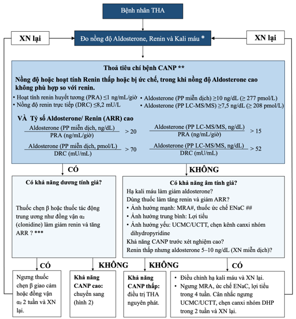 Với những bệnh nhân có kết quả tầm soát gợi ý CANP, các bước tiếp theo được thể hiện chi tiết trong hình 2. XN: xét nghiệm; UCMC/UCTT: ức chế men chuyển/ ức chế thụ thể; PP: phương pháp; DRC: direct renin concentration, nồng độ renin huyết tương; PRA: plama renin activity, hoạt tính renin huyết tương. * XN máu cần thực hiện vào buổi sáng ở tư thế ngồi; tránh tình trạng ứ máu tĩnh mạch (tháo garô sau khi đâm kim vào tĩnh mạch và đợi ít nhất 5 giây trước khi lấy máu) nhằm tránh tăng kali máu giả. ** Các giá trị aldosterone, renin và ARR trong Hình 1 và Bảng 1 có tính chất tham khảo. *** Cân nhắc khả năng dương tính giả do sử dụng thuốc chẹn beta giao cảm khi aldosterone <15 ng/dL (<415 pmol/L) bằng PP miễn dịch. # Drospirenone trong các thuốc tránh thai uống là một thuốc kháng thụ thể mineralocorticoid. ## Amiloride và Triamterene là các thuốc ức chế kênh natri biểu mô (ENaC).