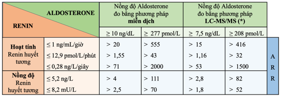 ARR: Aldosterone-Renin Ratio, tỷ số aldosterone-renin; LC-MS/MS: liquid chromatography–tandem mass spectrometry, sắc ký lỏng ghép khối phổ kép. Hiện tại ở Việt Nam chỉ đo được nồng độ renin huyết tương và nồng độ aldosterone đo bằng phương pháp miễn dịch. Lưu ý đơn vị sử dụng để chọn điểm cắt ARR tương ứng. Các giá trị aldosterone, renin và ARR có tính chất tham khảo. Độ nhạy và độ đặc hiệu của XN tầm soát phụ thuộc vào ngưỡng giá trị lựa chọn (không có ngưỡng tối ưu, vì mỗi ngưỡng lựa chọn đi kèm sự đánh đổi giữa tỷ lệ dương tính giả và âm tính giả). Nồng độ aldosterone và renin cũng bị ảnh hưởng bởi sự dao động cá nhân, phương pháp XN tại phòng XN địa phương và nhiều yếu tố khác. Kết quả cần được diễn giải dựa trên xác suất mắc CANP trước XN, các thuốc hoặc các tình trạng bệnh lý có thể gây nhiễu kết quả.