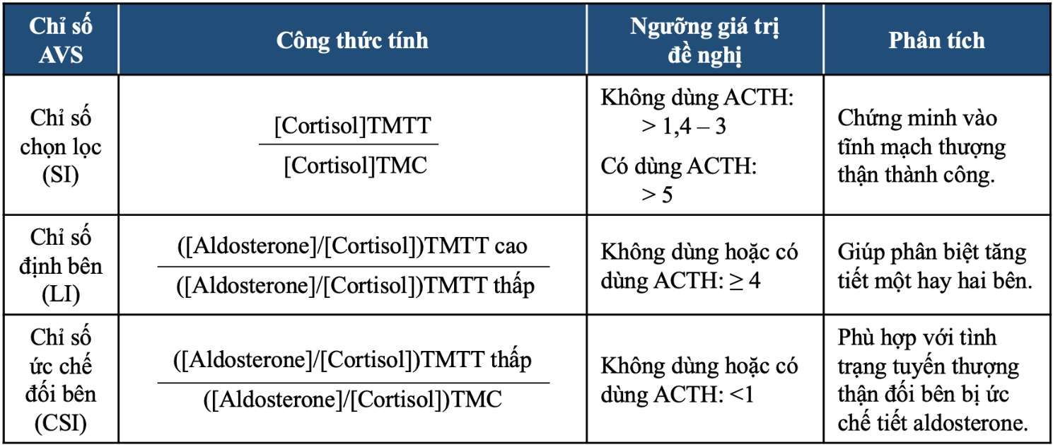 AVS: adrenal vein sampling, lấy máu tĩnh mạch thượng thận; TMTT: tĩnh mạch thượng thận; TMC: tĩnh mạch chủ; SI: selectivity index, chỉ số chọn lọc; LI: lateralization index, chỉ số định bên; CSI: contralateral suppression index; chỉ số ức chế đối bên; ACTH: adrenocorticotropic hormone, thường là Synacthen là thuốc dùng để kích thích sản xuất hormone tuyến thượng thận trong quá trình AVS.
