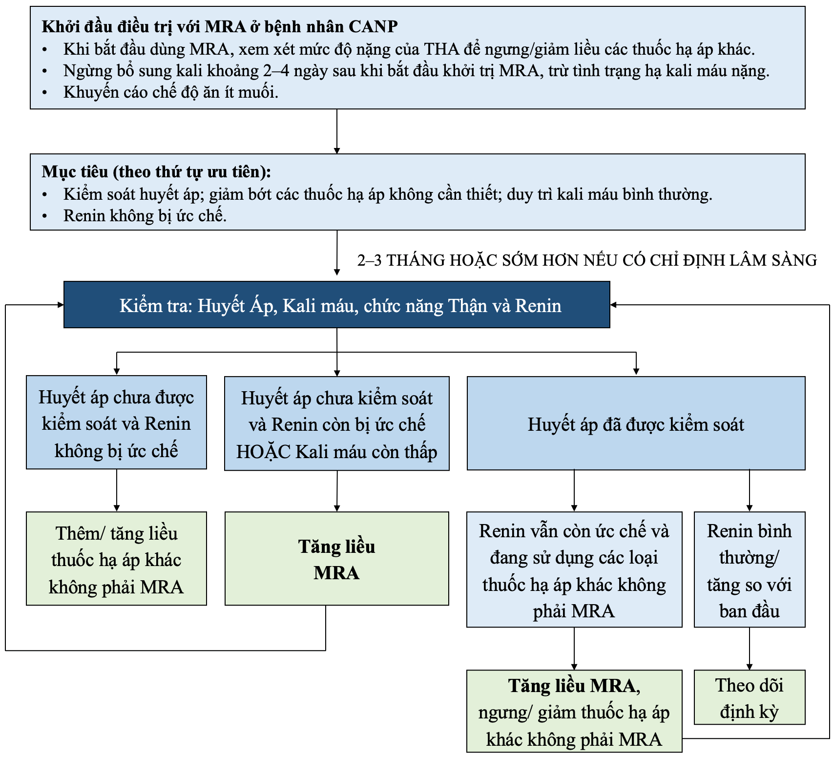 Đây là hướng dẫn chung, đáp ứng với MRA ở các bệnh nhân có thể rất khác. Quá trình khởi trị và chỉnh liều MRA gồm nhiều bước; mỗi lần chỉnh liều MRA đều đánh giá lại huyết áp và đáp ứng sinh hóa rồi tiếp tục theo phác đồ điều trị. Mục tiêu điều trị (theo thứ tự ưu tiên): (1) kiểm soát huyết áp, (2) kali bình thường. XN renin giúp đánh giá mức độ phong tỏa thụ thể mineralocorticoid, từ đó điều chỉnh liều MRA nhằm đạt các mục tiêu và ngưng/ giảm các thuốc hạ áp khác không phải MRA.