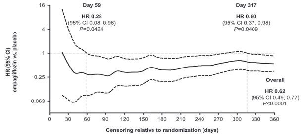 Đặc biệt, lợi ích bảo vệ tim mạch của Empagliflozin xuất hiện từ sớm và độc lập với kiểm soát đường huyết. Sau khi khởi trị 17 ngày, Empagliflozin giúp giảm đáng kể nguy cơ nhập viện vì suy tim, đồng thời giảm nguy cơ tử vong do tim mạch vào ngày thứ 59.