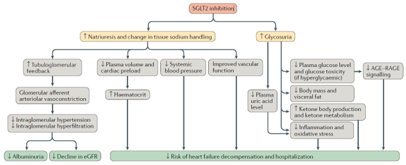 Trong suy tim, mặc dù đã có các liệu pháp chứng minh hiệu quả trong điều trị suy tim phân suất tống máu giảm (HFrEF), nguy cơ tử vong sau 5 năm vẫn còn rất cao (có thể lên đến 75%), và có rất ít bệnh nhân được sử dụng liều khuyến cáo của các thuốc điều trị. Hơn nữa, chưa có thuốc điều trị nào chứng minh được hiệu quả trên bệnh nhân suy tim phân suất tống máu bảo tồn, điều trị chủ yếu phụ thuộc vào quản lý bệnh đồng mắc và triệu chứng. Thuốc ức chế SGLT2 có thể là giải pháp có thực trạng này vì chúng tạo ra nhiều tác động sinh học độc lập với lợi ích kiểm soát đường huyết, điều này có thể giúp giải quyết các rối loạn sinh lý bệnh trong suy tim.