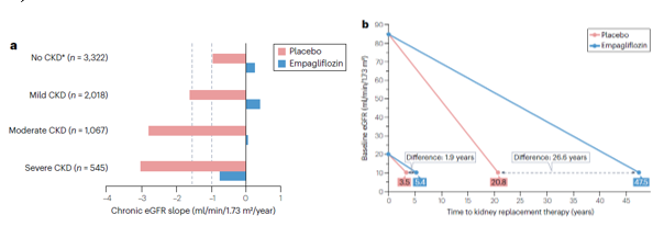Vào năm 2022, kết quả của nghiên cứu EMPA-KIDNEY được công bố tại hội nghị thường niên của Hội thận học Hoa Kỳ (American Society of Nephrology – ASN) bởi Nhóm nghiên cứu y khoa của Đại Học Oxford, Anh. Thử nghiệm EMPA-KIDNEY là nghiên cứu ngẫu nhiên, mù đôi, có đối chứng, thu nhận 6.609 người bệnh CKD có hoặc không có đái tháo đường, có hoặc không có đạm niệu. Empagliflozin chứng minh giúp giảm 28% tiến triển bệnh thận và tử vong tim mạch trên bệnh nhân bệnh thận mạn (HR; 0.72; 95% CI 0.64 – 0.82; P<0.0001). Lợi ích giúp làm chậm tiến triển bệnh thận của empagliflozin nhất quán trên các phân nhóm bệnh nhân có hoặc không có đái tháo đường, có hoặc không có albumin niệu, các phân nhóm nguyên nhân bệnh thận và các phân nhóm theo eGFR. Lợi ích này nhất quán với phân tích từ nghiên cứu EMPA-REG OUTCOME, Empagliflozin giúp làm chậm tiến triện bệnh thận bất kể mức độ CKD (không có, nhẹ, trung bình và nặng) thể hiện trong hình 6a. Người bệnh CKD có thể trì hoãn điều trị thay thế thận lên tới 26.6 năm nếu được sử dụng sớm với Empagliflozin (hình 6b).