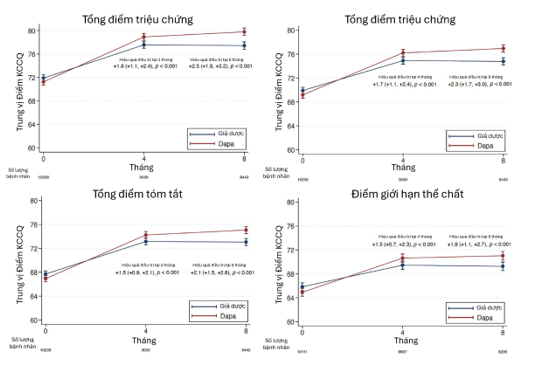 Điều trị bằng Dapagliflozin đã có sự cải thiện đáng kể về KCCQ-TSS trung bình sau 4 tháng (chênh lệch trung bình: +1,8 (khoảng tin cậy 95% [CI] +1,4;+2,4) và 8 tháng (chênh lệch trung bình: +2,5 [95% CI +1,8;+3,2] so với thời điểm phân nhóm ngẫu nhiên và nhất quán