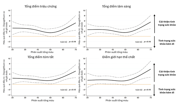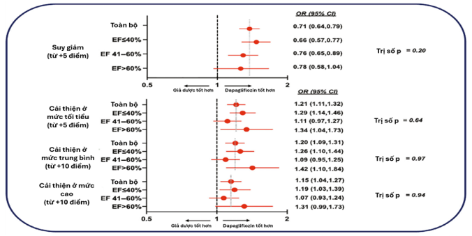 Phân tích tổng hợp từ hai nghiên cứu DAPA-HF và DELIVER cho thấy Dapagliflozin cải thiện toàn diện tình trạng sức khỏe và chất lượng cuộc sống theo bốn khía cạnh quan trọng của thang điểm KCCQ, bất kể mức phân suất tống máu, kể cả ở bệnh nhân có EF >60%.