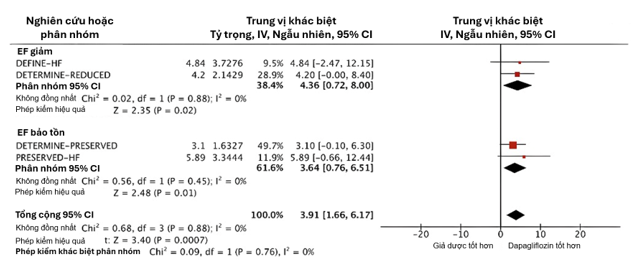 Phân tích phân nhóm theo phân suất tống máu cho thấy Dapagliflozin cải thiện điểm KCCQ-TSS rõ rệt ở cả nhóm HFrEF (MD = 2,98; 95% CI: 1,96–3,99; p < 0,00001; I² = 0%) và HFpEF (MD = 3,73; 95% CI: 1,16–6,30; p = 0,004; I² = 0%). Tương tự, điểm KCCQ-PLS cũng cải thiện đáng kể ở nhóm HFrEF (MD = 4,36; 95% CI: 0,72–8,00; p = 0,02; I² = 0%) và HFpEF (MD = 3,64; 95% CI: 0,76–6,51; p = 0,01; I² = 0%).