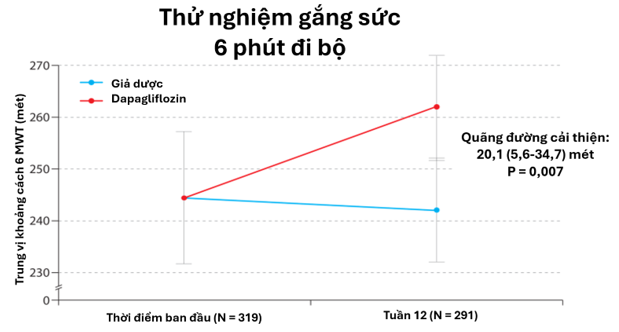 Dapagliflozin giúp cải thiện khả năng gắng sức và hoạt động hằng ngày của bệnh nhân suy tim, được đo lường khách quan bằng test đi bộ 6 phút (6MWT). Đây là một thang đo chức năng vận động quan trọng, phản ánh khả năng hoạt động thể lực trong sinh hoạt thường nhật của người bệnh suy tim.