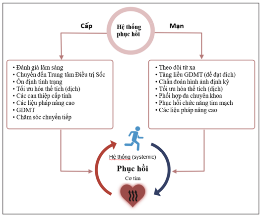 Hình 1. Vai trò của các hệ thống chăm sóc trong việc phục hồi cơ tim và phục hồi toàn thân ở bối cảnh cấp tính và mạn tính (6)