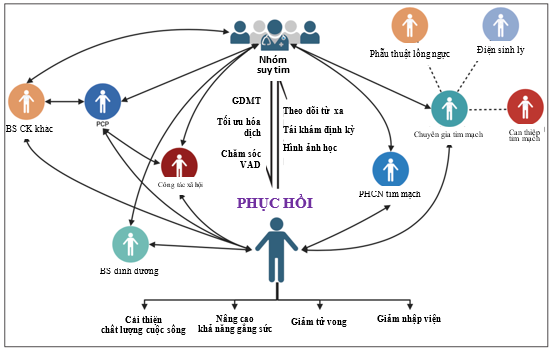 Các chương trình quản lý bệnh suy tim nhấn mạnh tích hợp chăm sóc toàn diện thông qua sự tham gia của các nhóm đa chuyên khoa, bao gồm bác sĩ tim mạch, bác sĩ nội khoa, điều dưỡng suy tim, nhân viên y tế hạng trung, nhà tâm lý, nhân viên xã hội, chuyên viên phục hồi chức năng, dược sĩ, chuyên gia dinh dưỡng và quản lý ca bệnh (Hình 2). Bằng chứng phong phú cho thấy vai trò thiết yếu của từng thành viên. Ví dụ, tích hợp điều dưỡng suy tim để theo dõi sát bệnh nhân sau xuất viện có thể cải thiện kết cục báo cáo bởi bệnh nhân và giảm tái nhập viện. Ngoài ra, dữ liệu khác cho thấy tập luyện tim mạch đều đặn cải thiện khả năng chức năng và chất lượng cuộc sống. Đồng thời, mô hình đa chuyên khoa có thể giảm tỷ lệ nhập viện vì suy tim, nhấn mạnh vai trò quan trọng của các đội chăm sóc này trong việc thúc đẩy hồi phục cơ tim (35,36).