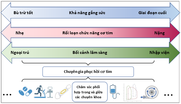 Hình 3: Phạm vi hoạt động của ‘Chuyên gia Phục hồi cơ tim’ trải rộng trên các mức độ khả năng gắng sức của bệnh nhân, mức độ nghiêm trọng của rối loạn chức năng cơ tim và bối cảnh lâm sàng, cũng như các liệu pháp cá thể hóa và sự phối hợp chăm sóc
