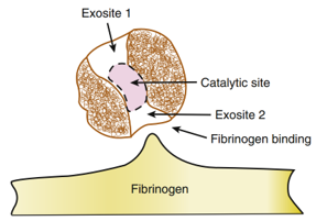 Như vậy, thrombin giữ vai trò trung tâm trong đáp ứng của thành mạch đối với tổn thương do bóng và stent trong PCI và vẫn là mục tiêu điều trị then chốt nhằm phòng biến chứng thiếu máu cục bộ trong PCI. Sơ đồ cấu trúc phân tử thrombin được thể hiện ở Hình 3. Các vị trí nhận diện cơ chất riêng biệt tham gia vào quá trình gắn heparin, fibrinogen và thrombomodulin; trong khi vị trí xúc tác (catalytic site) chịu trách nhiệm cho hoạt tính serine protease sẽ bị phong tỏa bởi các thuốc ức chế thrombin trực tiếp.