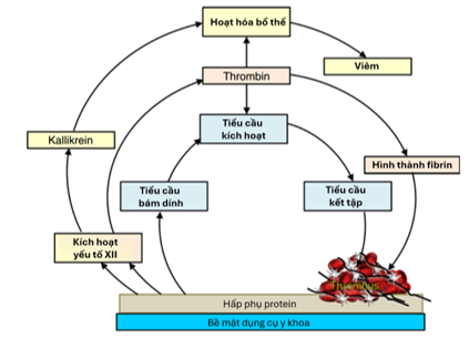 Hình 4. Cơ chế hình thành huyết khối trên bề mặt các dụng cụ trong can thiệp mạch vành
