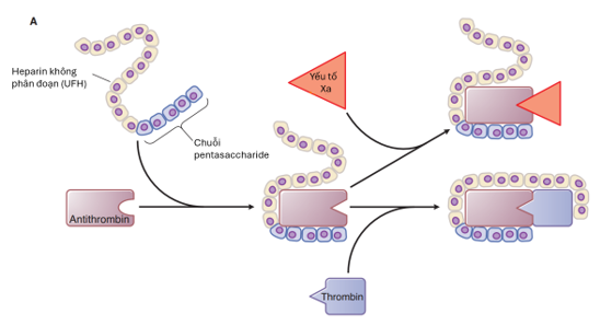 Heparin không phân đoạn (UFH) là một nhóm glycosaminoglycan dị hợp với các chiều dài khác nhau (5.000-30.000 Da) có ái lực cao với antithrombin. Sự gắn kết này làm tăng khả năng bất hoạt enzym của antithrombin trên thrombin, FXa và FIXa, nhưng tác dụng mạnh nhất vẫn là trên thrombin. UFH được coi là thuốc kháng thrombin gián tiếp vì tác dụng của nó phụ thuộc vào việc đồng thời gắn vào antithrombin và thrombin (Hình 5A). Khoảng hai phần ba các chế phẩm UFH chứa các phân tử ngắn (<18 saccharide) không đủ chiều dài để gắn đồng thời antithrombin và thrombin, do đó không biểu hiện hoạt tính kháng thrombin. Tuy nhiên, tác dụng kháng FXa của heparin không phụ thuộc vào việc gắn đồng thời với cả antithrombin và FXa, nên tác dụng antithrombin vẫn được quan sát ở UFH với kích thước chiều dài saccharide thay đổi.