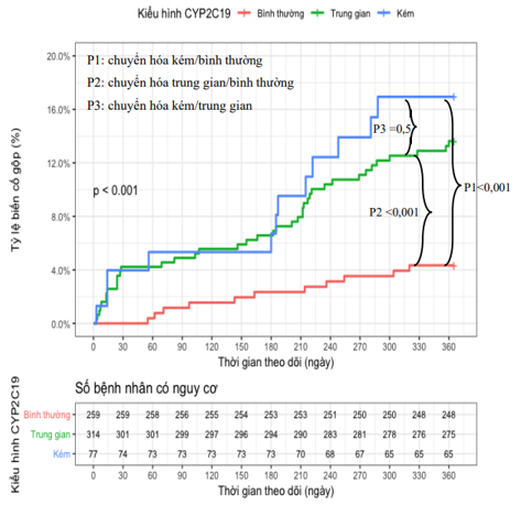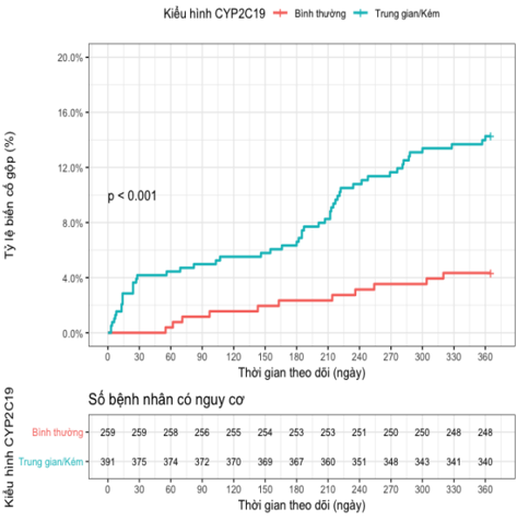 Kết quả: Tỉ lệ đột biến gen giảm chức năng CYP2C19 trong nghiên cứu là 60,1% (48,3% kiểu hình chuyển hóa trung gian và 11,9% kiểu hình chuyển hoá kém). Sau 1 năm theo dõi, tỉ lệ MACE là 9,7%. Trong đó, tỉ lệ MACE ở nhóm chuyển hóa kém là 15,6%, nhóm chuyển hóa trung gian là 12,7% và nhóm chuyển hóa bình thường là 4,2%, sự khác biệt có ý nghĩa với p = 0,0002. Phân tích đa biến cho thấy kiểu hình giảm chức năng CYP2C19 allele 2 và 3 là yếu tố dự đoán độc lập MACE trong 1 năm với OR=3,435, p < 0,001.