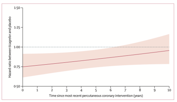 Ticagrelor cho thấy lợi ích lâm sàng ròng (net clinical benefit) rõ rệt: 9,3% (519/5558) so với 11,0% (617/5596) ở nhóm giả dược (HR = 0,85 [KTC 95%: 0,75–0,95], p = 0,005). Lợi ích của ticagrelor được duy trì bất kể thời gian kể từ lần PCI gần nhất.