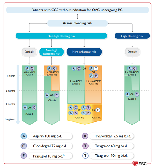 Việc lựa chọn nên dựa trên đặc điểm cụ thể của từng bệnh nhân. Việc kéo dài DAPT với clopidogrel hoặc prasugrel cũng có thể là một lựa chọn, tuy nhiên bằng chứng hỗ trợ cho lựa chọn này còn hạn chế. Ở những bệnh nhân được điều trị chống huyết khối tăng cường kéo dài, cần đánh giá lại nguy cơ chảy máu và thiếu máu cục bộ định kỳ5.