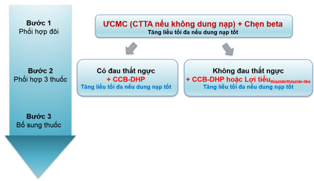 ESH (2023) và ESC (2024) đều khuyến cáo phối hợp chẹn beta và chẹn kênh canxi nhóm non-DHP cho bệnh nhân THA kèm BMV có triệu chứng đau ngực (khuyến cáo IA) và khống chế TST khi nghỉ về mức 60 đến dưới 80 lần/phút (khuyến cáo IB).