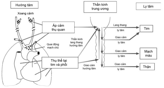 Như vậy, khi có bất kỳ sự thay đổi nào của thể tích nhát bóp thất trái, tần số tim và kháng lực mạch máu ngoại biên đều sẽ dẫn đến huyết áp tăng. Trong các yếu tố góp phần điều hòa HA (hệ thống thần kinh, thể dịch…) thì hệ thần kinh tự chủ giữ vai trò tối quan trọng trong sự hình thành, duy trì và điều hòa HA. Hệ thần kinh tự chủ bao gồm 2 phân hệ là giao cảm và phó giao cảm cùng các dây thần kinh phản hồi hướng tâm (cảm giác) liên quan đến từng phân hệ (Hình 1).