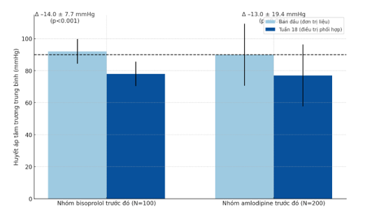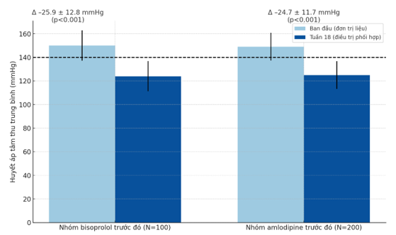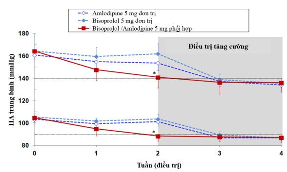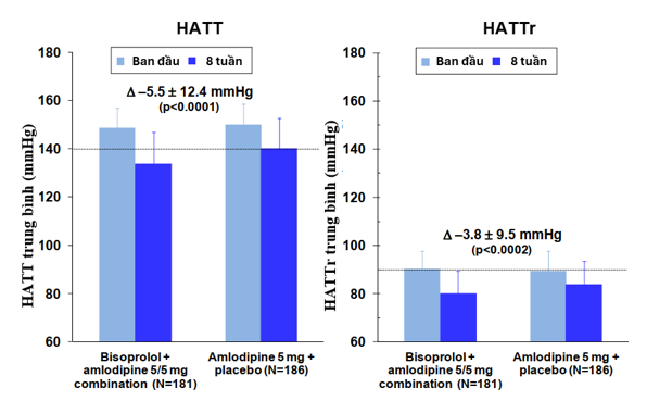 Một thử nghiệm lâm sàng ngẫu nhiên đã đánh giá viên SPC bisoprolol/amlodipine ở 200 bệnh nhân THA không được kiểm soát tối ưu bằng đơn trị liệu với amlodipine 5 mg hoặc bisoprolol 5 mg. Ban đầu, BN được chia ngẫu nhiên thành hai nhóm (“A” và “B”); tất cả đều được dùng bisoprolol/amlodipine 5/5 mg trong 6 tuần. BN có HA chưa được kiểm soát tối ưu (≥ 140/90 mmHg) sau 6 tuần ở nhóm A được tăng liều lên bisoprolol/amlodipine 5/10 mg, trong khi BN kiểm soát chưa tối ưu ở nhóm B được tăng liều lên dạng phối hợp 10/5 mg. HA được đánh giá lại ở tuần 12, khi những BN vẫn chưa kiểm soát tối ưu được HA sẽ được dùng viên phối hợp 10/10 mg trong 6 tuần nữa. Những BN có HA được kiểm soát tốt (< 140/90 mmHg) tiếp tục duy trì điều trị đang dùng tại mỗi giai đoạn. Kết quả chính của thử nghiệm là sự thay đổi trung bình của huyết áp tâm thu (HATT) từ thời điểm ban đầu (khi BN đang được điều trị đơn trị liệu hạ huyết áp) đến tuần thứ 18. Sự thay đổi trung bình của SBP là đáng kể, có ý nghĩa cả về lâm sàng và thống kê (p < 0,001), và gần như giống nhau ở cả nhóm BN đã dùng bisoprolol trước đó và nhóm đã dùng amlodipine trước đó (lần lượt –26 mmHg và –25 mmHg) (Hình 3).