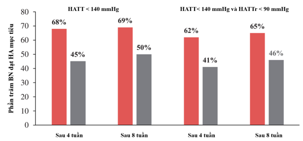 Giảm đáng kể huyết áp tâm trương (HATTr) cũng được ghi nhận (lần lượt –14 mmHg và –13 mmHg) (Hình 4). Phần lớn BN (74%) kiểm soát tốt HA với liều phối hợp bisoprolol/amlodipine 5/5 mg. Khi tăng liều của phối hợp đôi thì 88% BN đạt HA mục tiêu vào cuối nghiên cứu.