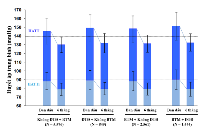 Giá trị trung bình của HATT cao hơn được ghi nhận ở những BN mắc bệnh tim mạch (148,5 mmHg), đái tháo đường (149,3 mmHg), hoặc cả hai (151,5 mmHg) ở thời điểm ban đầu; so với 145,5 mmHg ở những BN không có các bệnh đi kèm này (HATTr tương tự giữa các nhóm). HA >140/90 mmHg ở 28% BN không có bệnh đi kèm, so với 31% (bệnh tim mạch), 33% (đái tháo đường tuýp 2), và 38% (cả hai bệnh đi kèm), phù hợp với quan sát này. Những khác biệt này không còn rõ rệt vào cuối nghiên cứu, vì HATT trung bình dao động trong khoảng từ 130,0 mmHg đến 132,2 mmHg ở cả bốn nhóm (Hình 8).