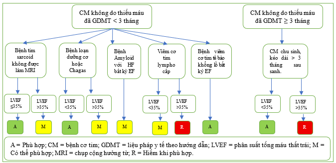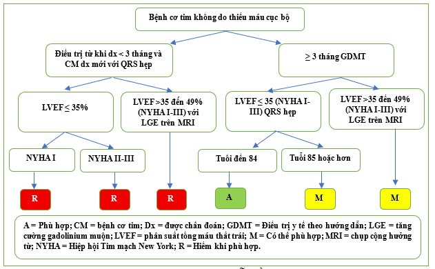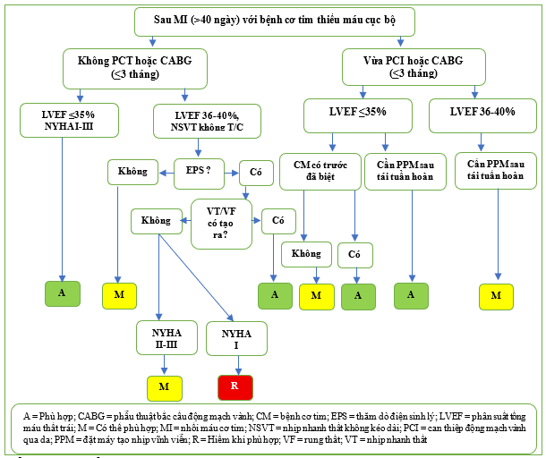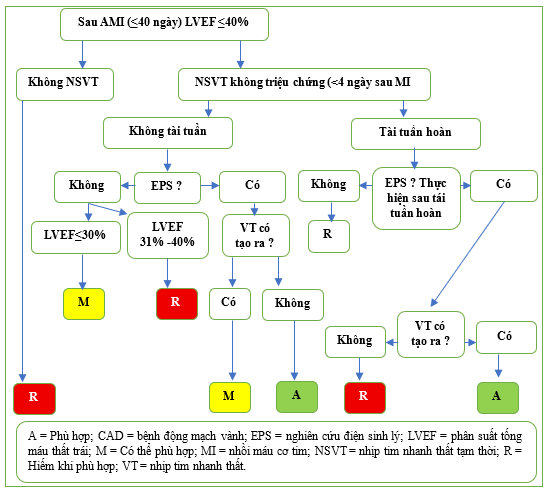 A = Phù hợp; CAD = bệnh động mạch vành; EPS = thăm dò điện sinh lý; LVEF = phân suất tống máu thất trái; M = Có thể phù hợp; MI = nhồi máu cơ tim; NSVT = nhịp nhanh thất không kéo dài; R = Hiếm khi phù hợp; VT = nhịp nhanh thất.
