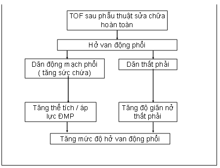 Tại thời điểm ngay sau phẫu thuật sửa chữa TOF, thất phải thường bị phì đại nên độ giãn nở thấp; đường kính các động mạch phổi thường kém phát triển hoặc giá trị ở ngưỡng thấp, do đó khả năng chứa cũng thấp; và tần số tim còn cao, làm cho thời gian thì tâm trương ngắn. Vì vậy, mặc dù diện tích lỗ hở van động mạch phổi tương đối lớn ngay sau phẫu thuật, nhưng sự kết hợp của các yếu tố trên làm giảm thiểu tác động lên mức độ hở phổi. Theo thời gian, thể tích nhát bóp thất phải tăng dần, làm gia tăng kích thước và sức chứa của động mạch phổi và các nhánh, gây giãn thất phải. Kết hợp với thời gian thì tâm trương kéo dài ra khi nhịp tim giảm dần theo tuổi, những thay đổi này dẫn đến dẫn đến tiến triển mức độ hở van động mạch phổi ( Sơ đồ 1)